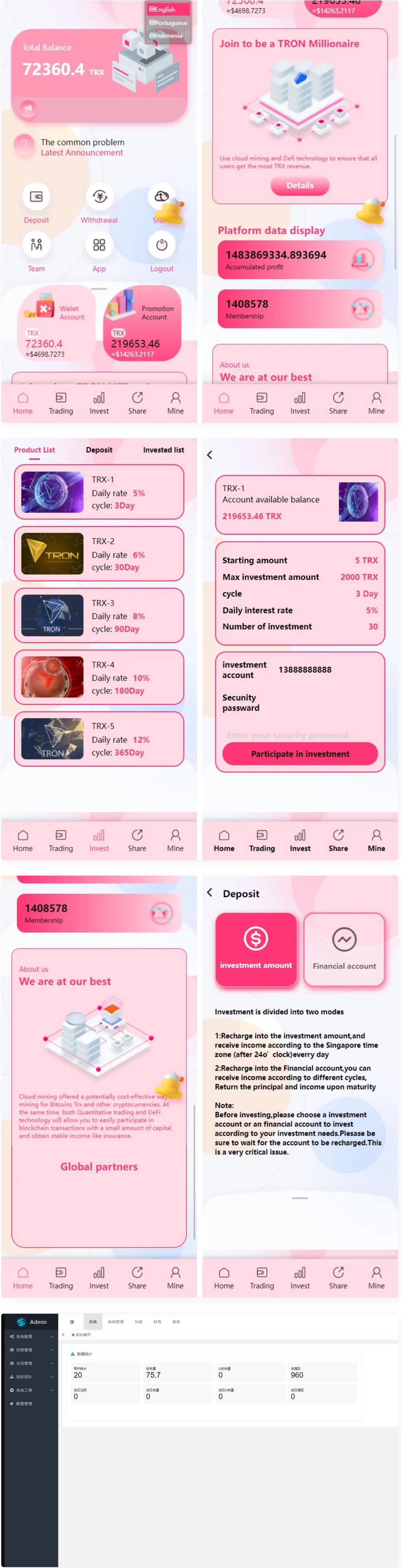 价值500u的trx粉色UI多语言理财网站系统源码