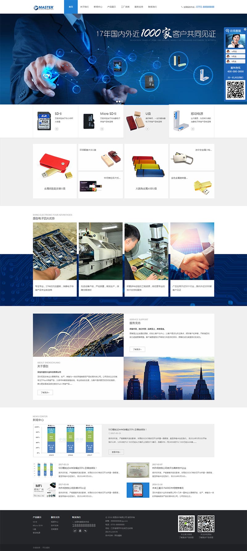 蓝色大气的电子产品科技公司官网,电子存储产品制造商企业网站模板html下载。主要有:关于我们、新闻中心、产品展示、工厂资质、服务支持、联系我们等总共7个页面。