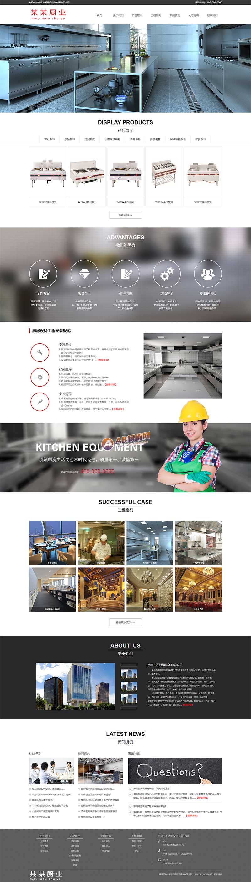 宽屏的南昌康洁不锈钢厨房厨卫设备生产安装公司,厨房设备公司网站模板html下载。主要页面有:关于我们、产品展示、成功案列、产品详情、新闻资讯、新闻详情等总共7个页面代码。