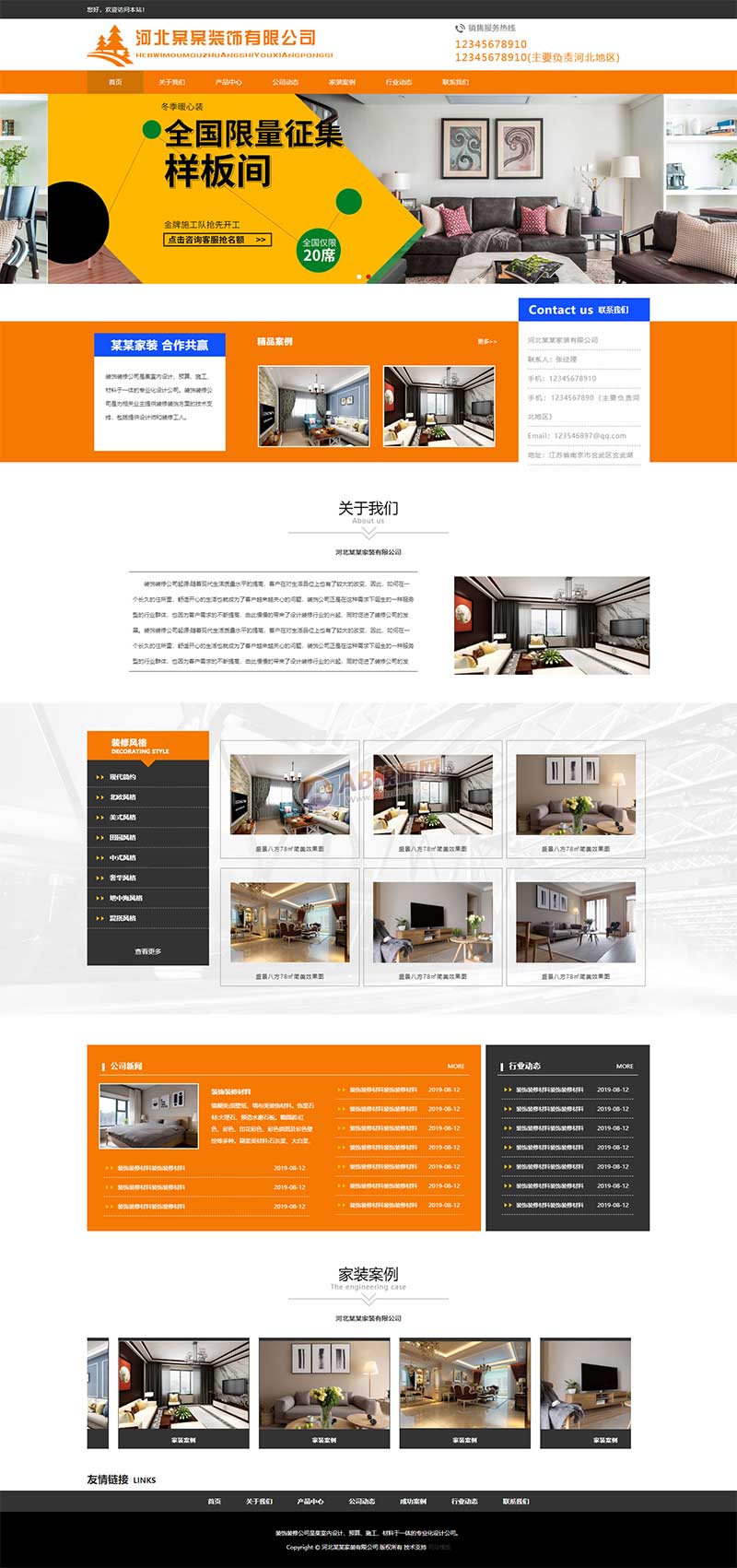 一款橙色的室内装修行业/房屋装饰设计企业网站html模板下载。包含:公司概况、精品案例、家装设计、新闻动态、联系我们等9个页面。