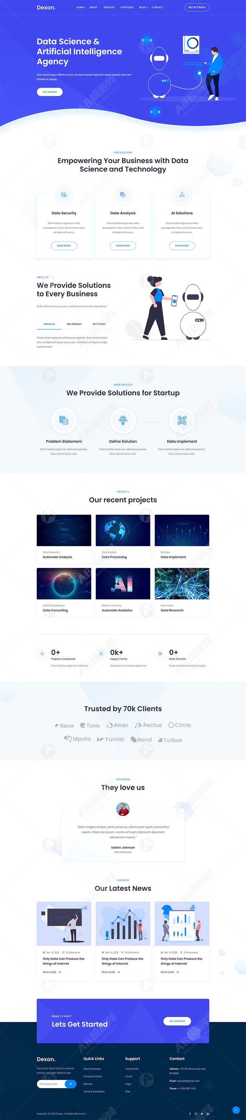 一款蓝色多用途的AI人工智能大数据分析网站模板。包含:大数据业务、人工智能业务、数据自动化创业公司、人工智能业务、咨询、金融及专业服务。是一个功能强大、易于使用、高度可定制响应式模板。