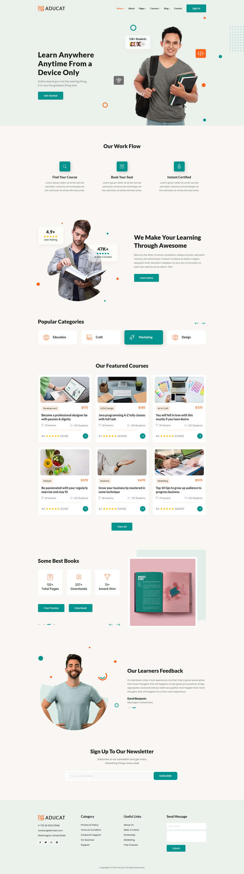 一个基于Bootstrap5、HTML5、CSS3、JavaScript和jQuery的在线教育/课程学习网站响应式模板。这是一个很好的模板,可以用来建造任何学校,大学,学院,学费中心,语言,电子学习,LMS,或任何其他在线教育学习业务,公司或平台。为了快速创建您的在线教育平台,附带了10个HTML页面,包括主页、关于页面、联系页面、课程页面、课程详情页面、登录页面、注册页面等。