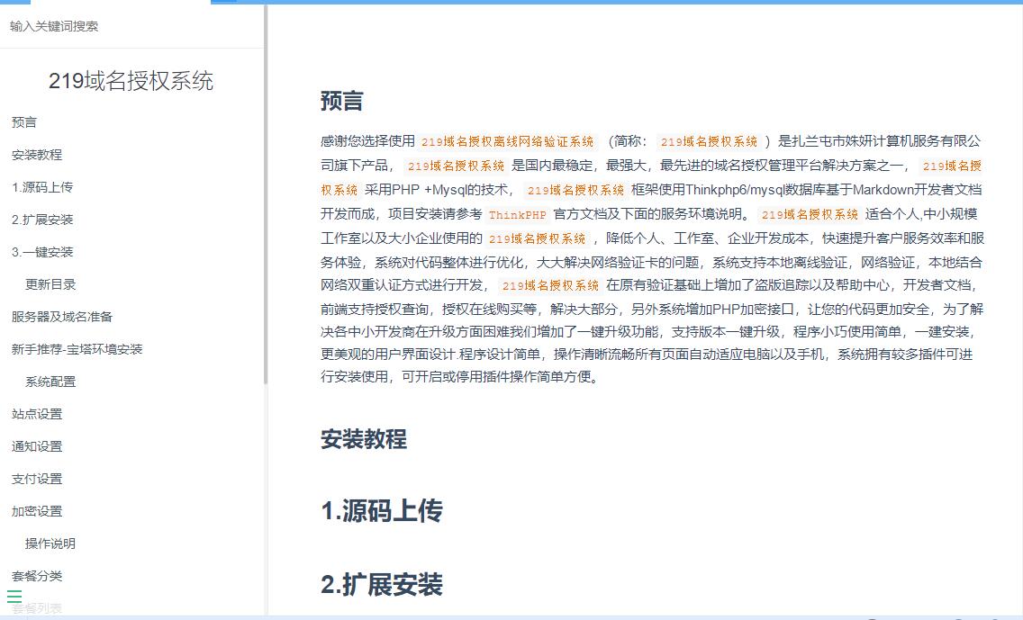 感谢您选择使用219域名授权离线网络验证系统(简称:219域名授权系统)是扎兰屯市姝妍计算机服务有限公司旗下产品,219域名授权系统是国内最稳定,最强大,最先进的域名授权管理平台解决方案之一,219域名授权系统采用PHP +Mysql的技术,219域名授权系统框架使用Thinkphp6/mysql数据库基于Markdown开发者文档开发而成,项目安装请参考ThinkPHP官方文档及下面的服务环境说明。219域名授权系统适合个人,中小规模工作室以及大小企业使用的219域名授权系统,降低个人、工作室、企业开发成本,快速提升客户服务效率和服务体验,系统对代码整体进行优化,大大解决网络验证卡的问题,系统支持本地离线验证,网络验证,本地结合网络双重认证方式进行开发,219域名授权系统在原有验证基础上增加了盗版追踪以及帮助中心,开发者文档,前端支持授权查询,授权在线购买等,解决大部分,另外系统增加PHP加密接口,让您的代码更加安全,为了解决各中小开发商在升级方面困难我们增加了一键升级功能,支持版本一键升级,程序小巧使用简单,一建安装,更美观的用户界面设计.程序设计简单,操作清晰流畅所有页面自动适应电脑以及手机,系统拥有较多插件可进行安装使用,可开启或停用插件操作简单方便。