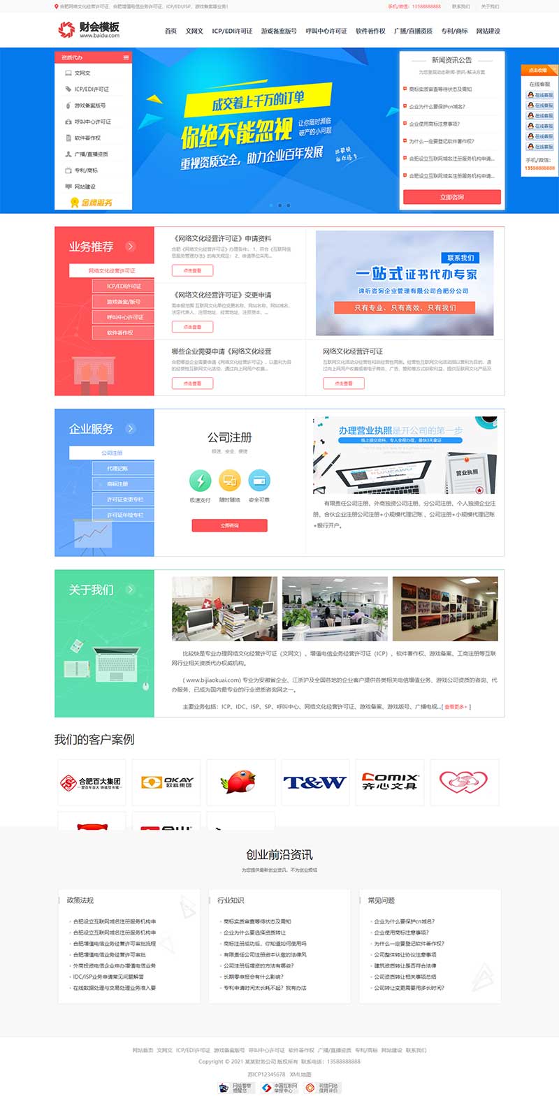 本套织梦模板采用织梦5.7内核开发的模板,这款模板使用范围广,不仅仅局限于一类型的企业,资质办理、财务公司、工商注册类的网站都可以用该模板。你只需要把图片和文章内容换成你的即可,颜色都可以修改,改完让你耳目一新的感觉!布局规整,利于用户体验,手工书写DIV+CSS,代码精简。