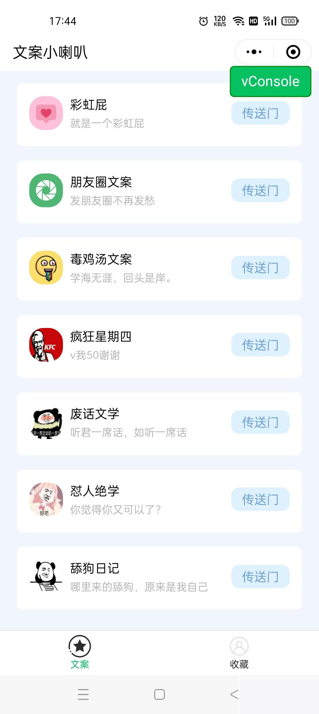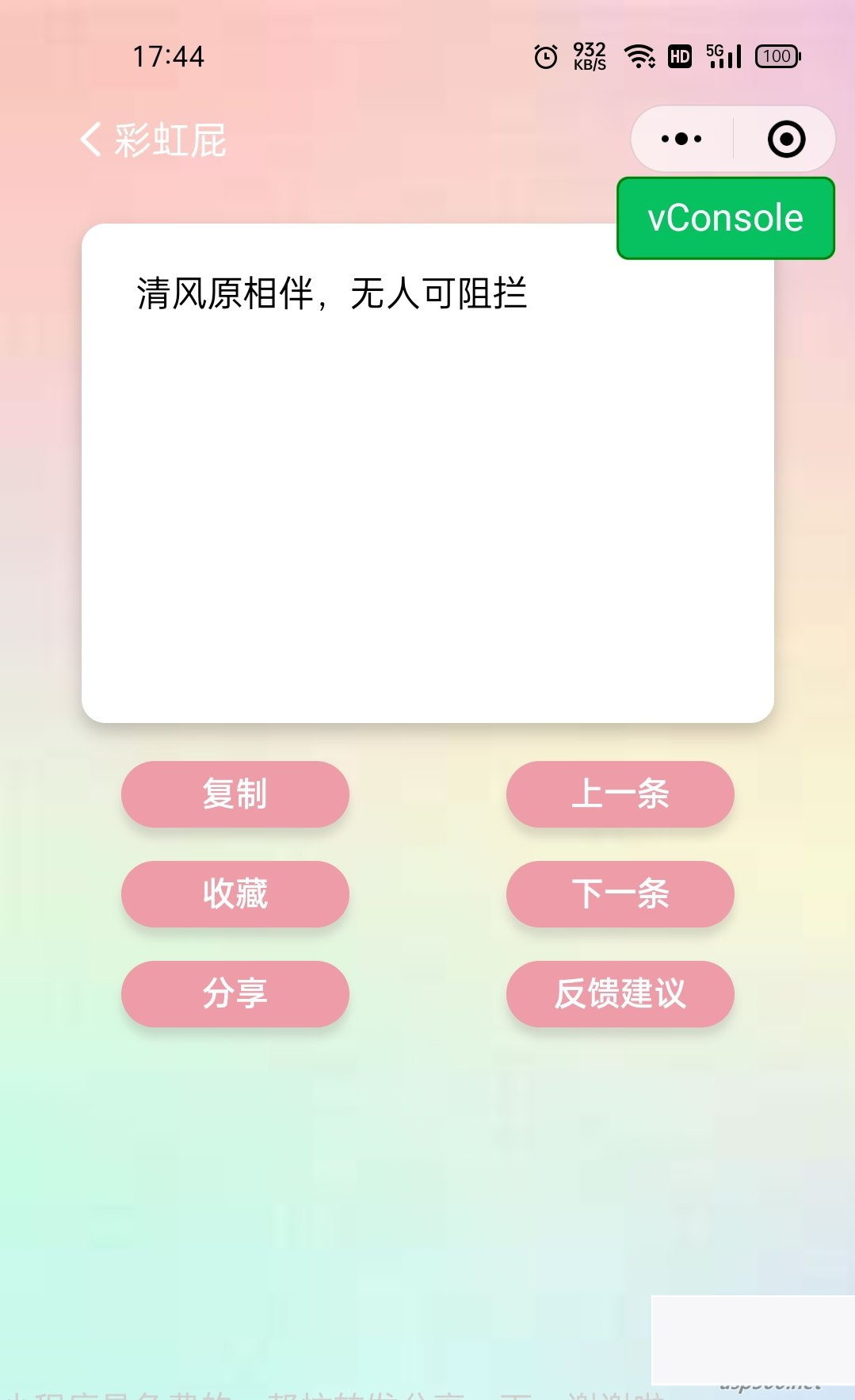 彩虹屁文案工具小程序源码,1.此文案小程序主要功能为分享各种有趣幽默的文案,2.免服务器免域名,源码只提供彩虹屁,朋友圈,毒鸡汤API接口,其他需自行查找替代,3.小程序拥有复制收藏功能,可自行体验4.设置流量主可自行查看代码进行更换id。