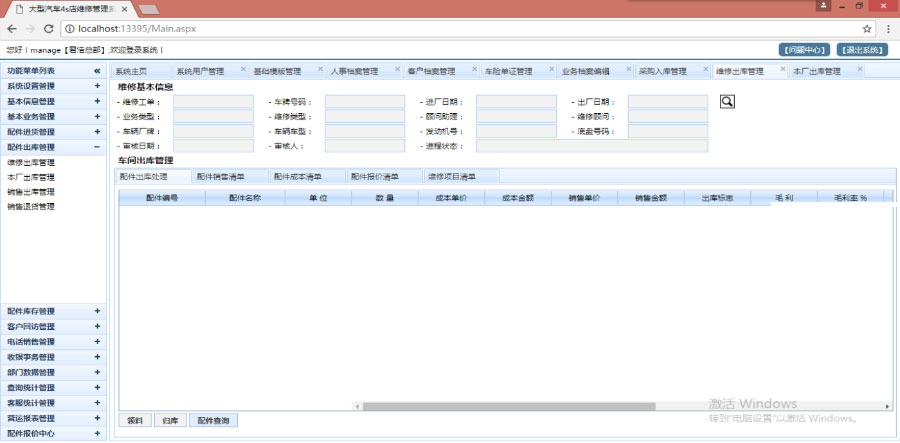 出库单、出库历史查询、报价单、报价历史查询、出库调拨单、出库调拨历史查询、出库退货单、出库退货历史查询、急件查询、维修单、维修查询(在厂进度查询、出厂结算查询、维修项目查询、维修领料查询、其它项目查询)、估价单、估价查询、投诉登记、投诉查询、库存查询、库存修改、库存盘点、盘点查询、出库应收款、入库应付款、出库结款历史、入库结款历史、收入登记、支出登记