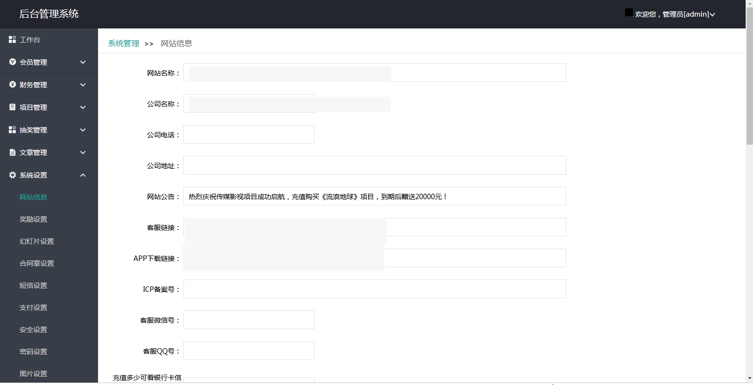 伪静态就是自带的thinkphp 前台只有手机版可以访问,没有电脑页 导入数据库 修改数据库信息文件:Public/config.php 码支付配置文件:codepay/codepay_config.php 修改码支付ID与通信密钥 拉到最下面配置数据库连接 短信为中国网建接口,修改文件\\\\\\\\App\\\\\\\\Common\\\\\\\\Common\\\\\\\\other.php 46行47行 申请地址:www.smschinese.cn 自动分红页面地址(需24小时一直打开):你的域名/index.php?s=/Handle/jiesuan 后台登录:域名/chuhzg19tvgabxm/login.html 用户名:admin 密码:www.ohbbs.cn