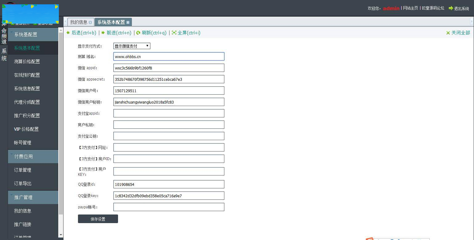 php 版本5.4 导入数据库和源码 配置数据库账号密码 config/inc_config.php 70行左右 后台:域名+/acs 账号:admin 密码:www.ohbbs.cn 后台域名绑定到目录acs 测算域名绑定到目录ffsm 页脚内容修改在网站后台修改! QQ互联 回调地址:http://域名/?ac=qqconnect