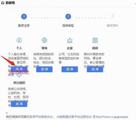3、点击注册,自动跳转选择页面,一般选择个人,其他选项需要一些资质证明。