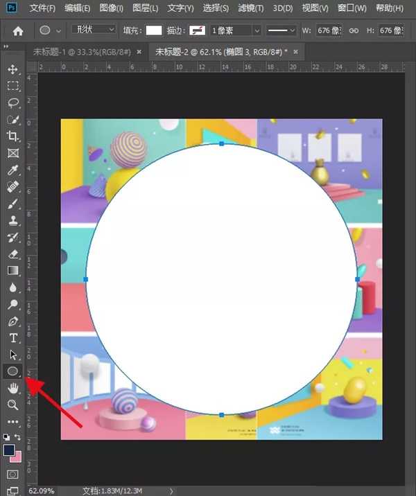 第六步:选择椭圆工具,按着shift键画一个圆,然后选择移动工具,把圆移到中心。