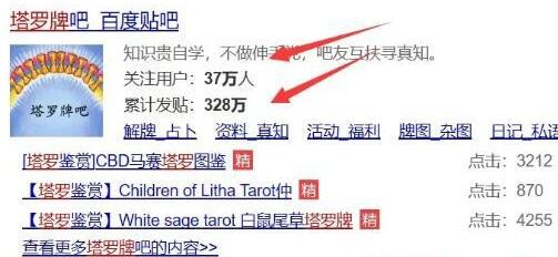 还有一个一定要说的,就是百度贴吧。我们先看一下塔罗牌这一个贴吧,到底有多少个人关注?累计发贴量是多少?