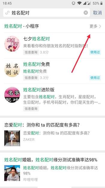 如图,然后在搜索框里面输入“姓名配对”,进入页面后点击右上角更多。