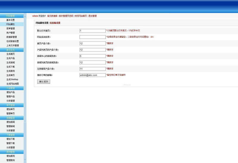 4、独有精心设计的前台产品展示模块,可方便地在后台进行开启、关闭子功能;后台采用产品属性管理接口,使产品添加、管理更加智能化;