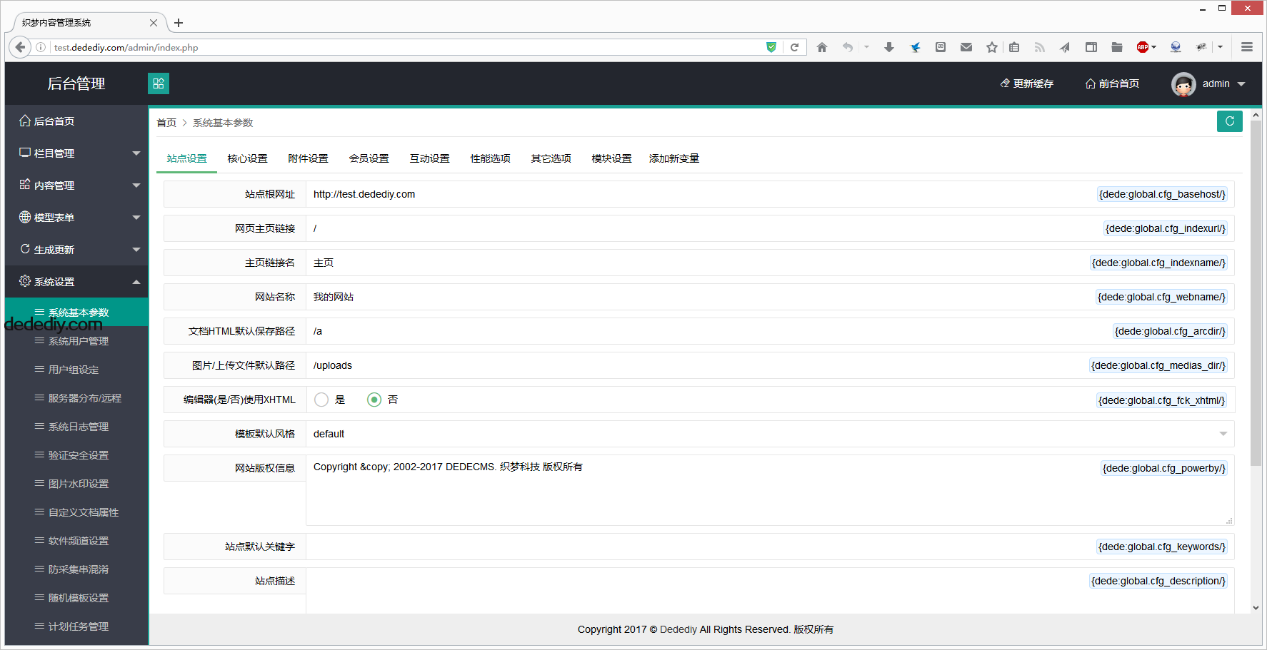 上传完文件后,清空浏览器临时文件,浏览器里打开 http://域名/dede 预览效果